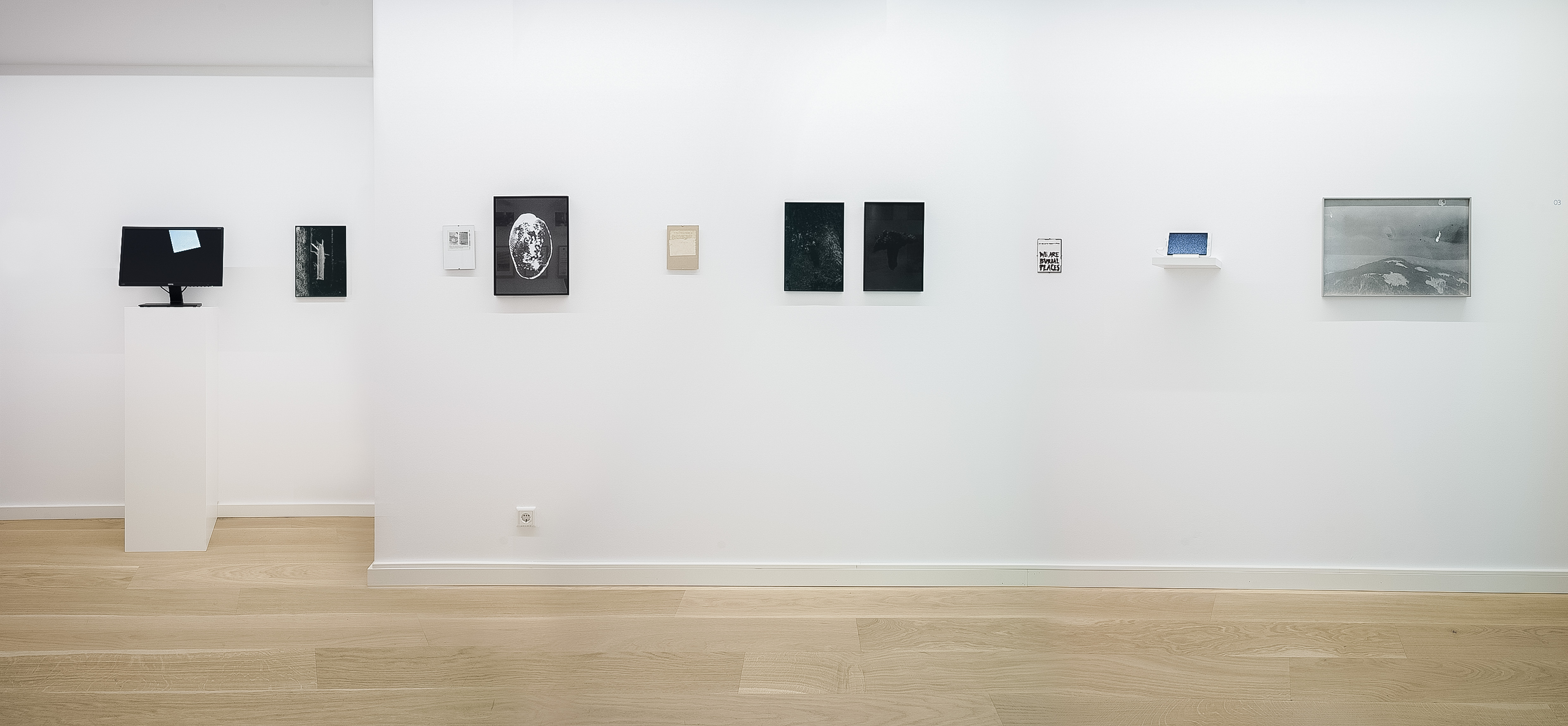 digitale C-Prints, Silvergelatine-Abzüge, gerahmte Laserdrucke, bemalter Spiegel, Videoclips im Loop