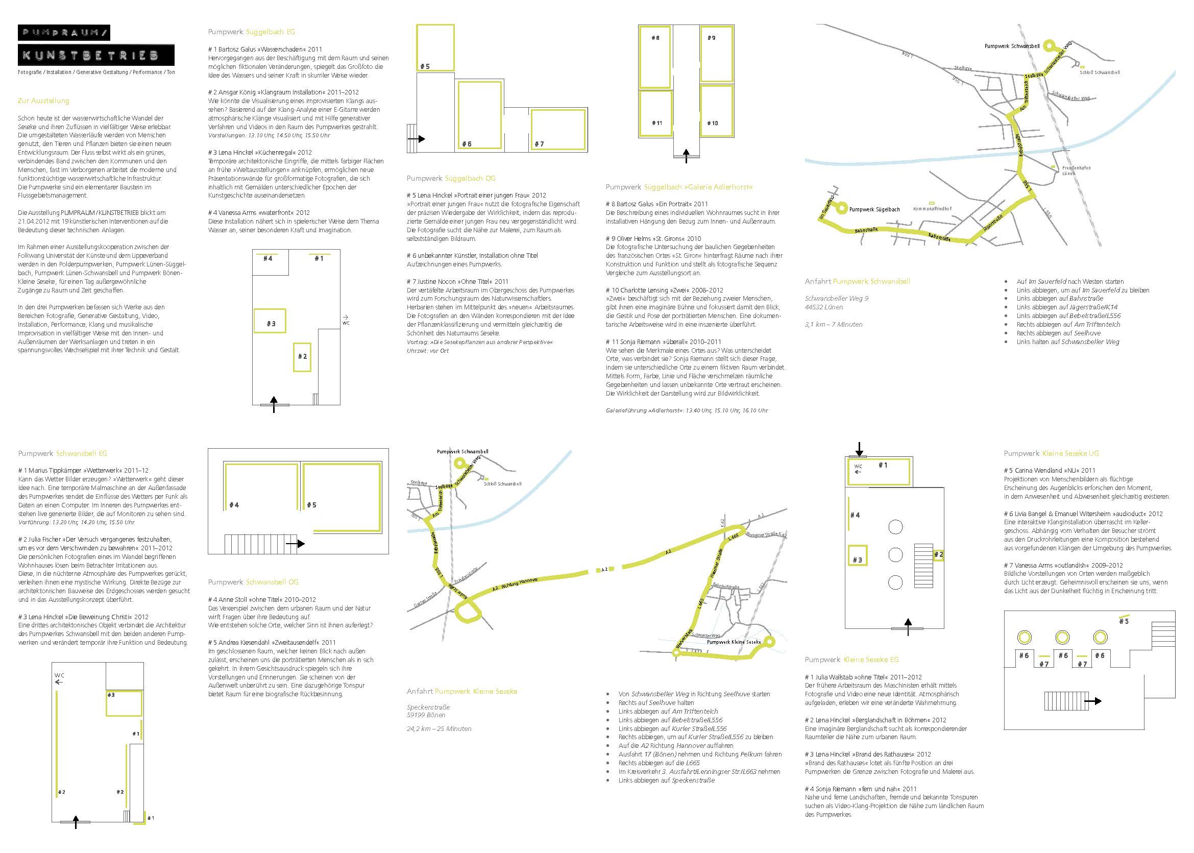 Schon heute ist der wasserwirtschaftliche Wandel der Seseke und ihren Zuflüssen in vielfältiger Weise erlebbar. Er ist Teil des großangelegten Renaturierungsprojektes der Emscher. Die umgestalteten Wasserläufe werden von Menschen genutzt, den Tieren und Pflanzen bieten sie einen neuen Entwicklungsraum. Die Pumpwerke sind ein elementarer Baustein im Flussgebietsmanagement. Die Ausstellung PUMPRAUM / KUNSTBETRIEB blickt am 21.04.2012 mit 19 künstlerischen Interventionen auf die Bedeutung dieser technischen Anlagen.