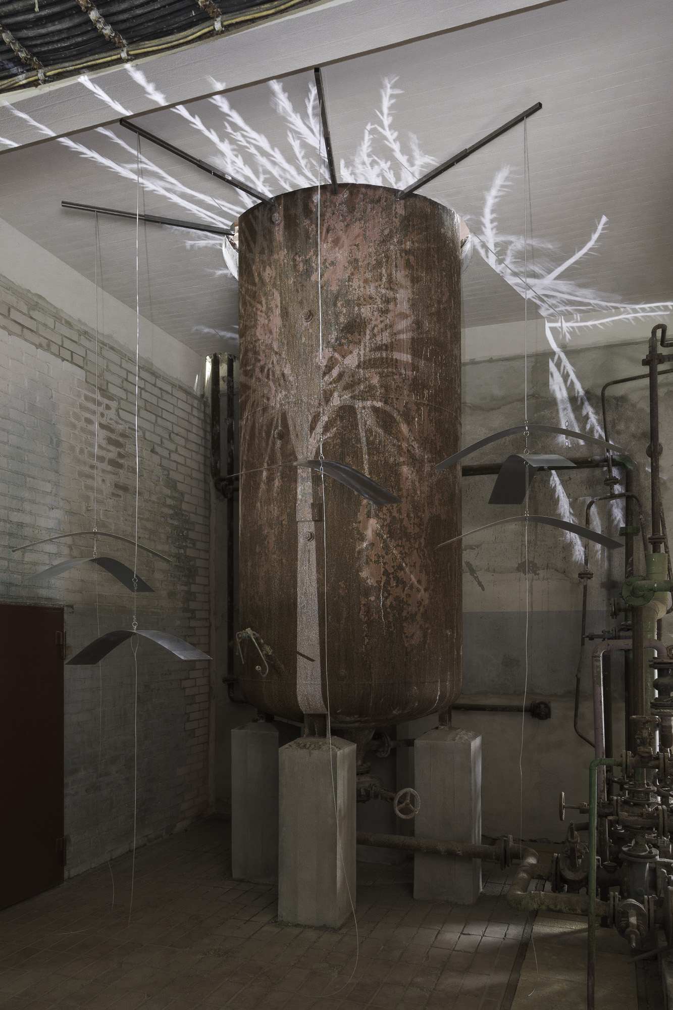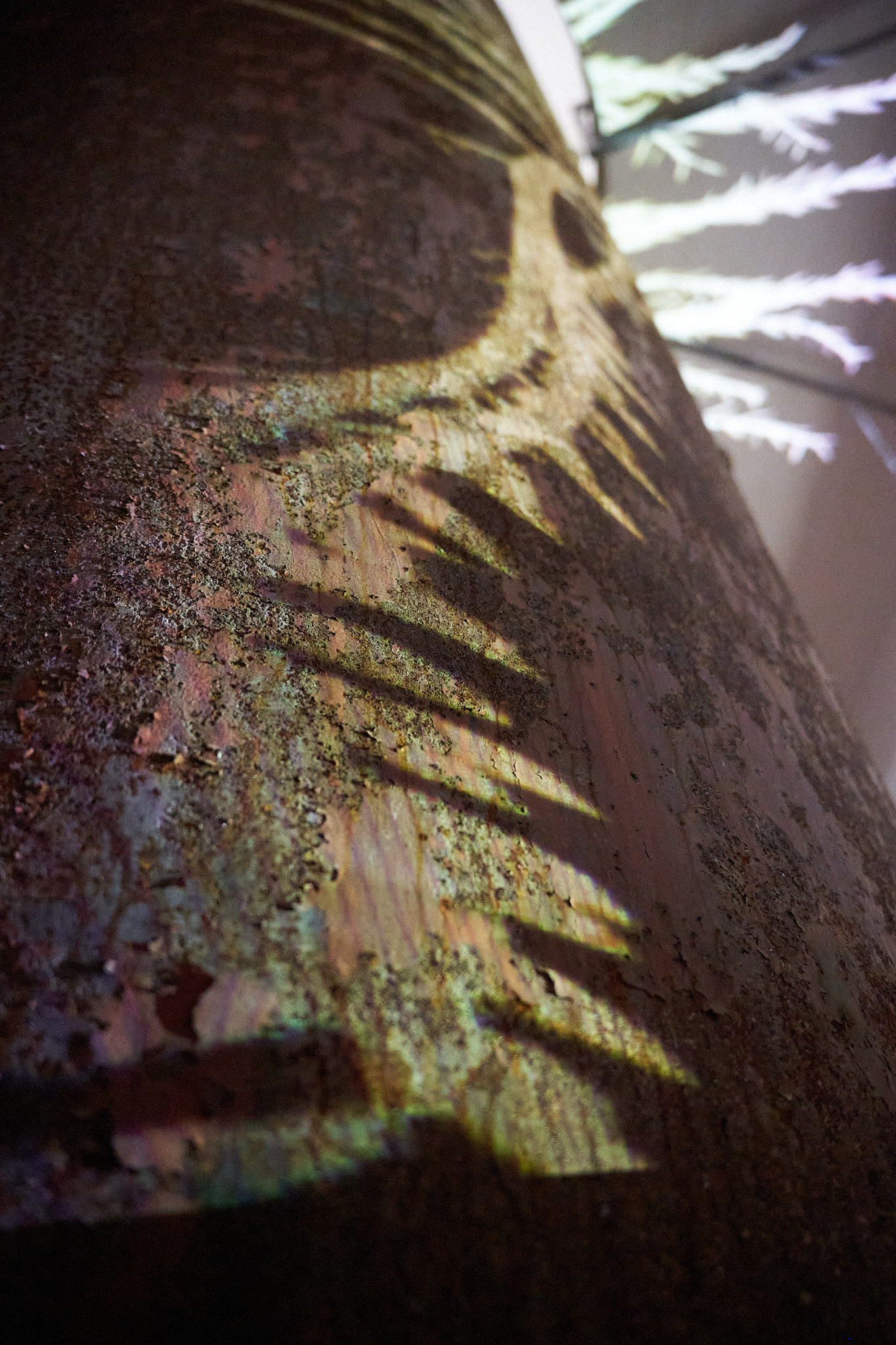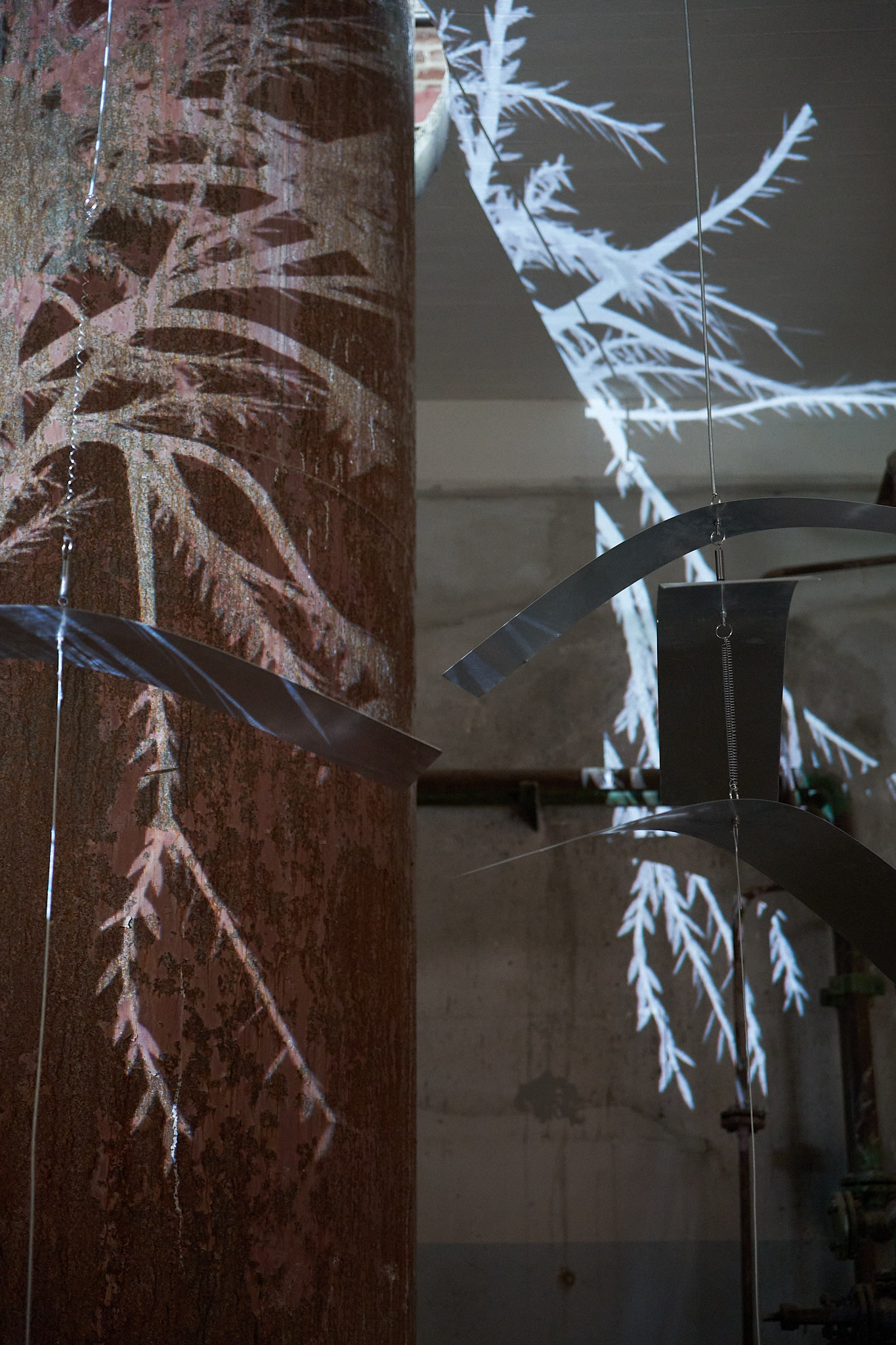 Die Projektion eines animierten Baums auf dem historischen Dampfkondensatbehälter im Erdgeschoss mutet mystisch an und verfälscht bewusst die Natur im Industrieraum. Der Baum des Lebens hat sich in der Industrie angesiedelt. Naturklänge und Tonspuren vermischen sich mit Bewegungstönen der Stahlbleche, die von den Besuchenden mit Hand erzeugt werden. Zusammen mit dem rostfarbenen Hintergrund und den beweglichen Stahlobjekten bildet der projektierte, künstliche Baum eine visuelle, mehrdimensionale Einheit. Symbolisiert wird das Ungleichgewicht zwischen industrieller Vergangenheit und Natur.