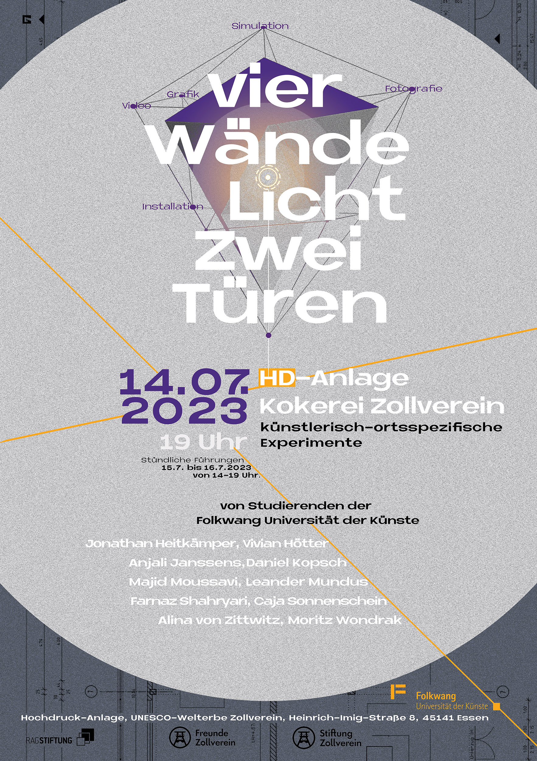 Mit Vier Wände, Licht, zwei Türen haben Studierende des Fachbereichs Gestaltung der Folkwang Universität der Künste medienübergreifende, künstlerische Experimente in der Hochdruckanlage des UNESCO-Welterbes Zollverein gezeigt.
