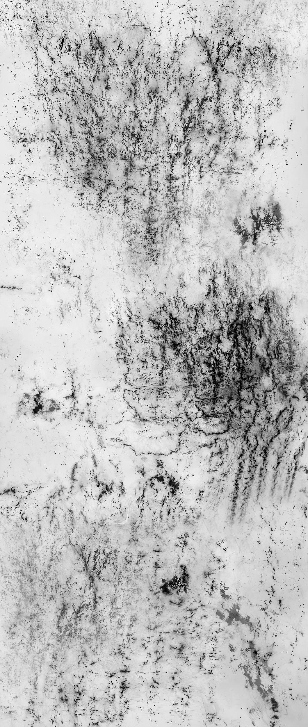 In weiteren Experimenten, grau und weiß, werden die Motivelemente der Frottagen zu einer freien Komposition zusammengefügt. Entstanden ist ein großformatiger Druck auf Stoff, der die Elemente der Frottage aufnimmt, aber mittels Digital Compositing nach grafischen Gesichtspunkten neu ordnet.