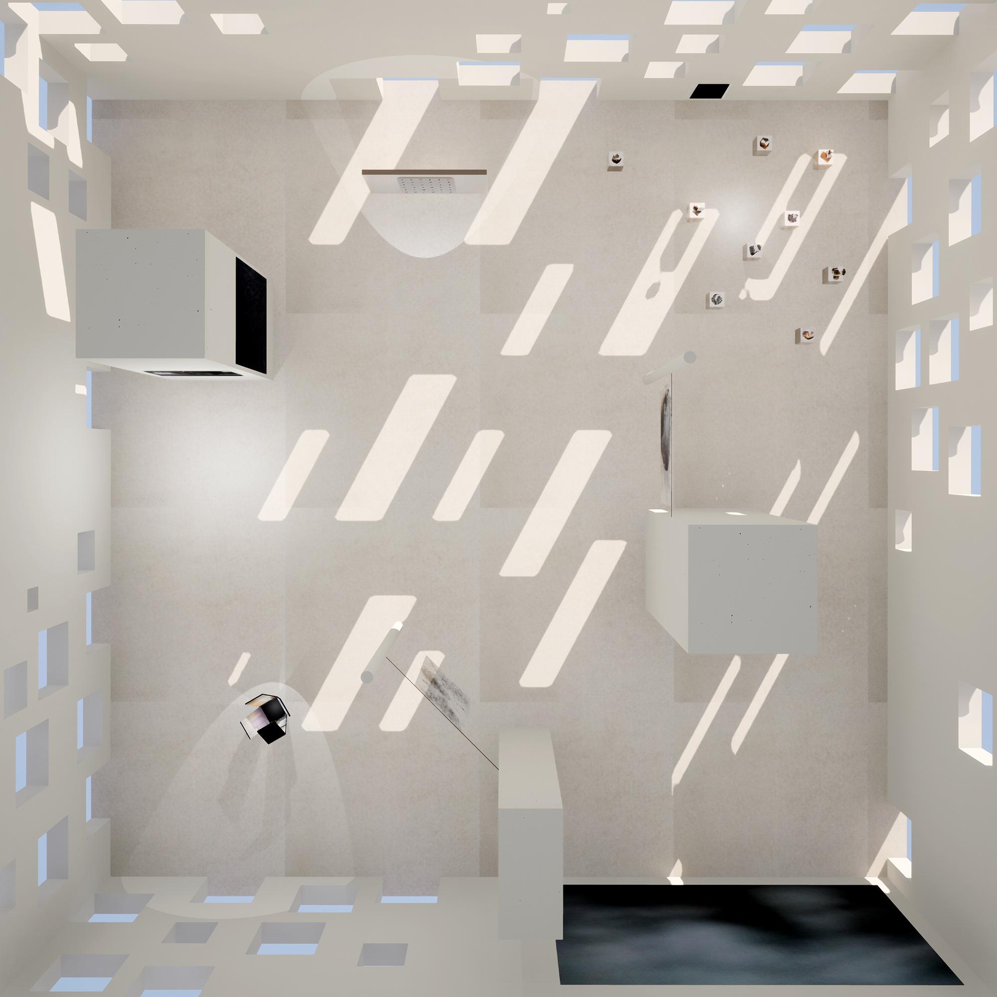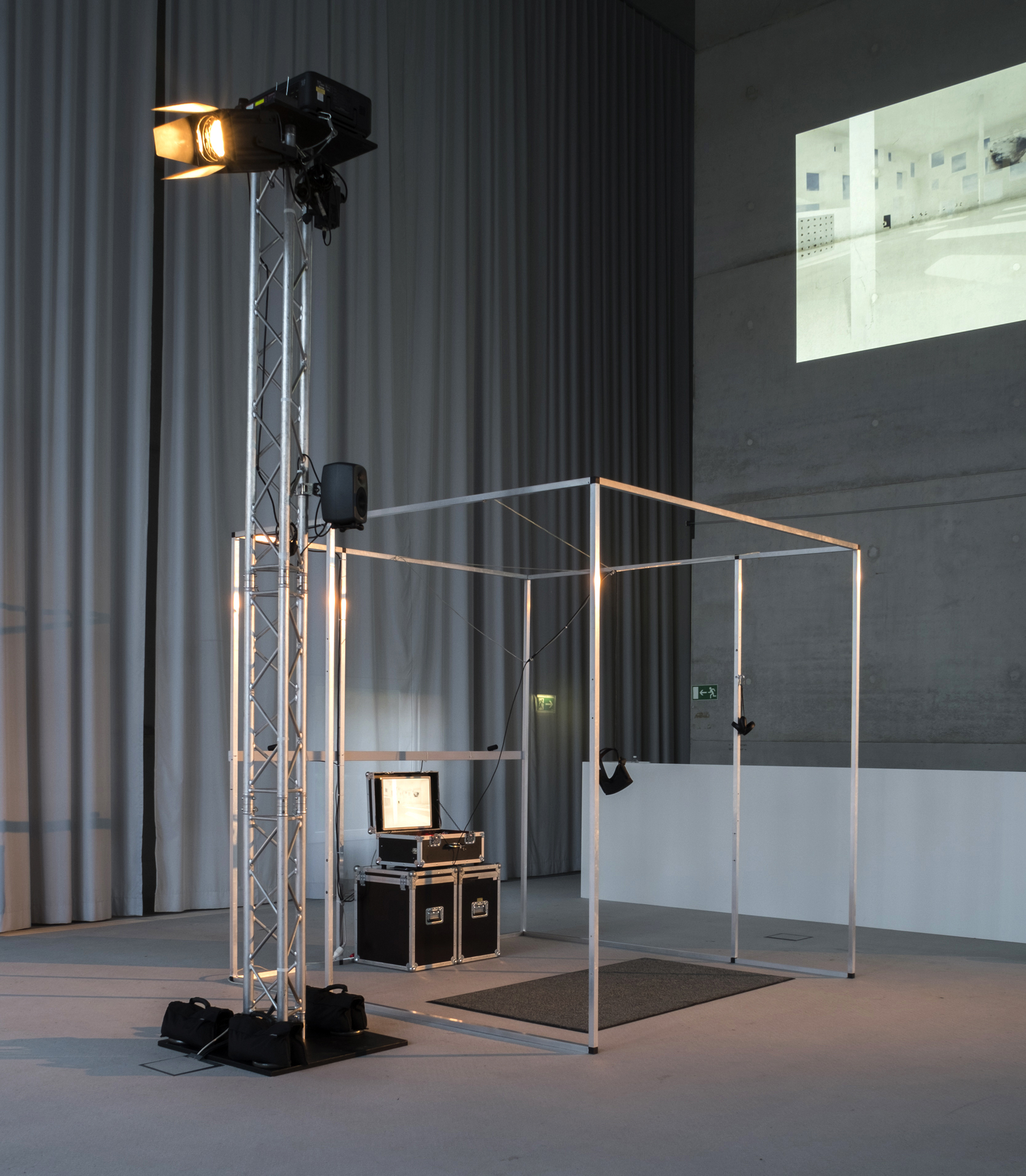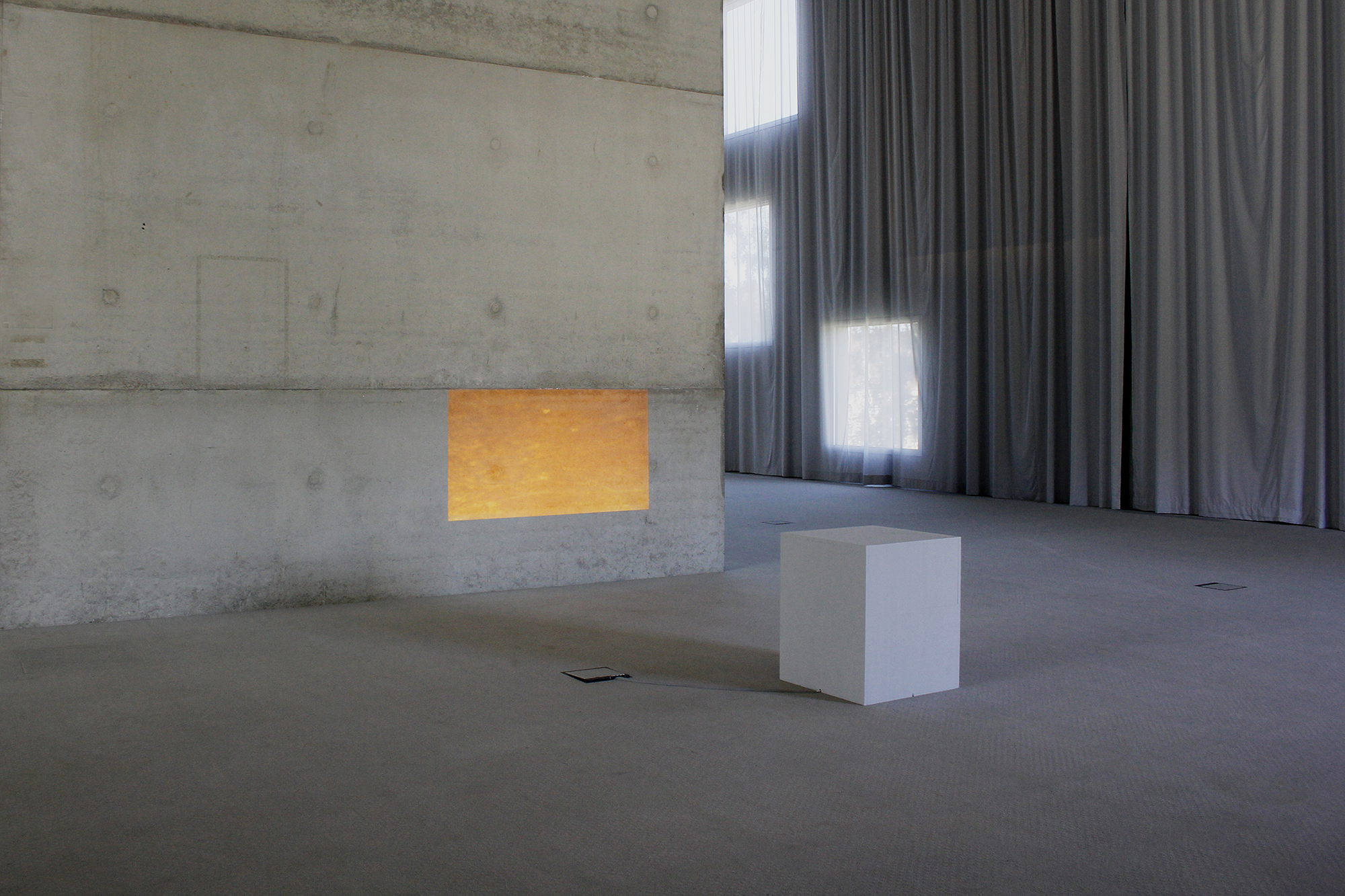 Neben den visuellen Eindrücken im Raum selbst, bildeten ein virtuell Simulationsraum mit eigenen Zeit- und Helligkeitsregimen und räumlich unterschiedlich erfahrbare klangliche Kompositionen weitere Ebenen des Ausstellungsgefüges.