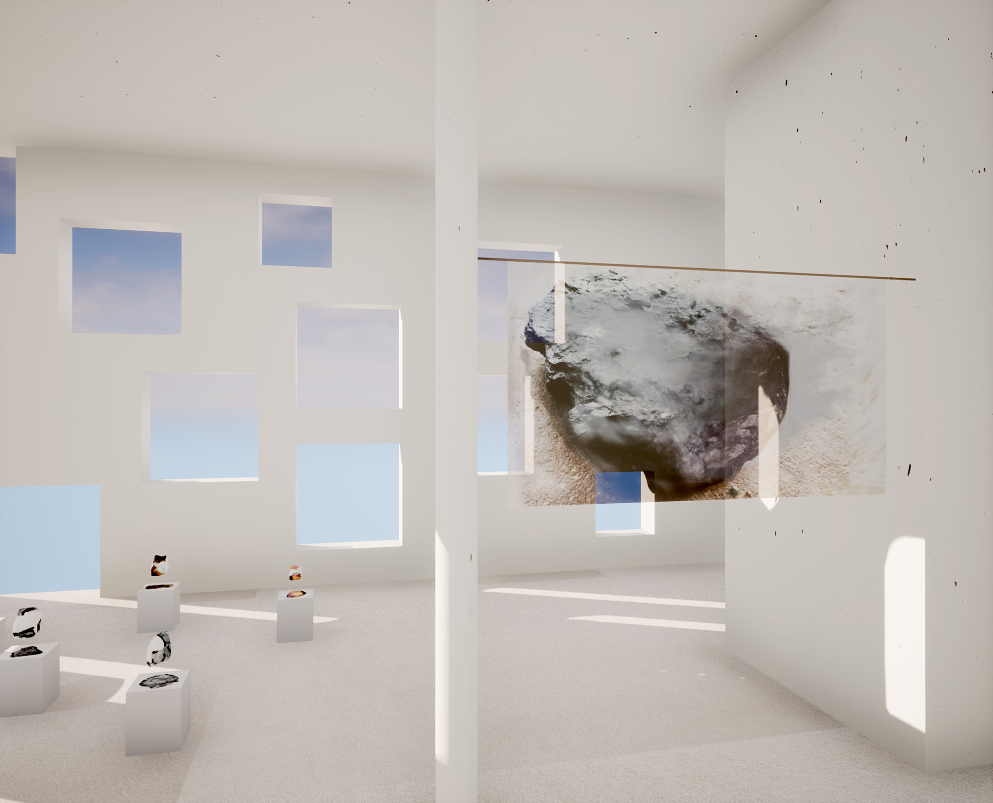 Ein Pendant zum reellen Ausstellungsraum bildete eine Arbeit, die diesen als digitales Konstrukt erlebbar machte. Sie versetzte Besucher*innen in die Lage, den Ausstellungsraum gänzlich anders wahrzunehmen: Als virtuelle Realität erschien der Innenraum das SANAA Gebäudes hell erleuchtet. Die hierin ausgestellten Werke wurden, der realen Welt offenbar enthoben, in gleichförmiger Helligkeit dargestellt. Auswahl und Form nicht aller, aber einiger Arbeiten unterschieden sich von jenen der „realen“ Ausstellung, sodass zwei ebenso ähnliche wie unähnliche Wirklichkeiten aufeinandertrafen.