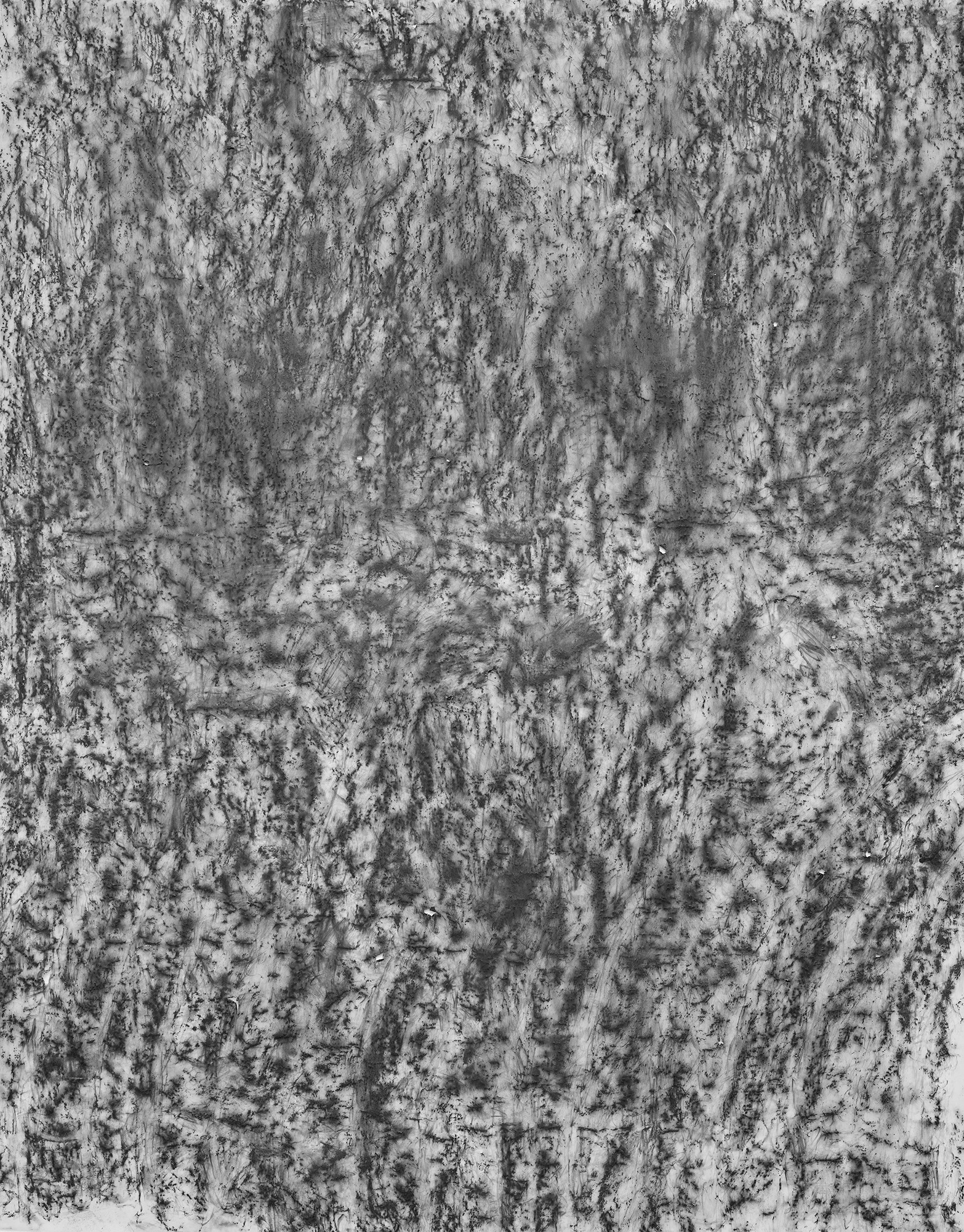 Form, Struktur und Oberfläche bestimmen als maßgebliche Parameter die Arbeiten schwarz und weiß und grau und weiß. Sie sind das Ergebnis eines experimentellen Umgangs mit fotografischem Material und den diversen Möglichkeiten, sich in dieses einzuschreiben. In schwarz und weiß wird eine fotografisch erzeugte Aufnahme durch Zeichnungen ergänzt, die als Frottagen mit dem Graphitstift auf Pergament erzeugt wurden. Als Motiv für die fotografische Aufzeichnung wurde die Abformung eines Kohlestrebs ausgewählt, der sich durch eine besondere Struktur, Schwärze und glänzende Oberflächenbeschaffenheit auszeichnet. Die händisch erstellten Frottagen sind am gleichen Gegenstand wie die klassische Fotografie abgenommen.